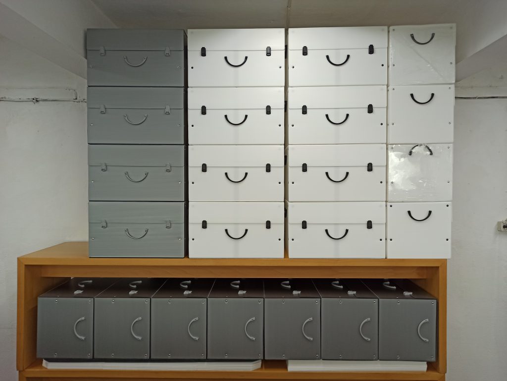 Nasz produkt startowy to seria organizerów na dokumenty. W tym pudełka na segregatory o wymiarach wewnętrznych 500x320x290 i 425x320x290. Trzy pudełka uniwersalne o wymiarach wewnętrznych 430x300x240 ; 375x300x240 i 320x270x210. Mniejsze pasują wymiarami w środek do większych co znacząco zmniejszy koszty wysyłki dla tych co zamówią zestawy. Na pięciu wymiarach ta seria kuferków się zakończy, dodawane będą jedynie następne kolory tekpolu.